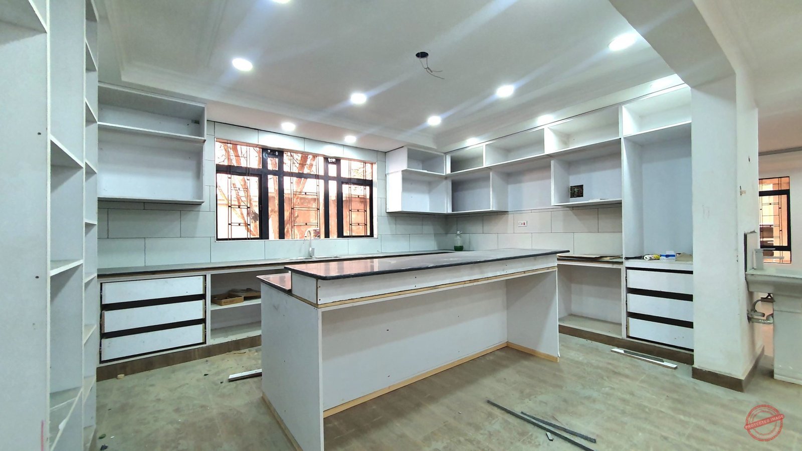 An expansive modern kitchen with an island and pantry. Provision for inbuilt oven, microwave and fridge already done.